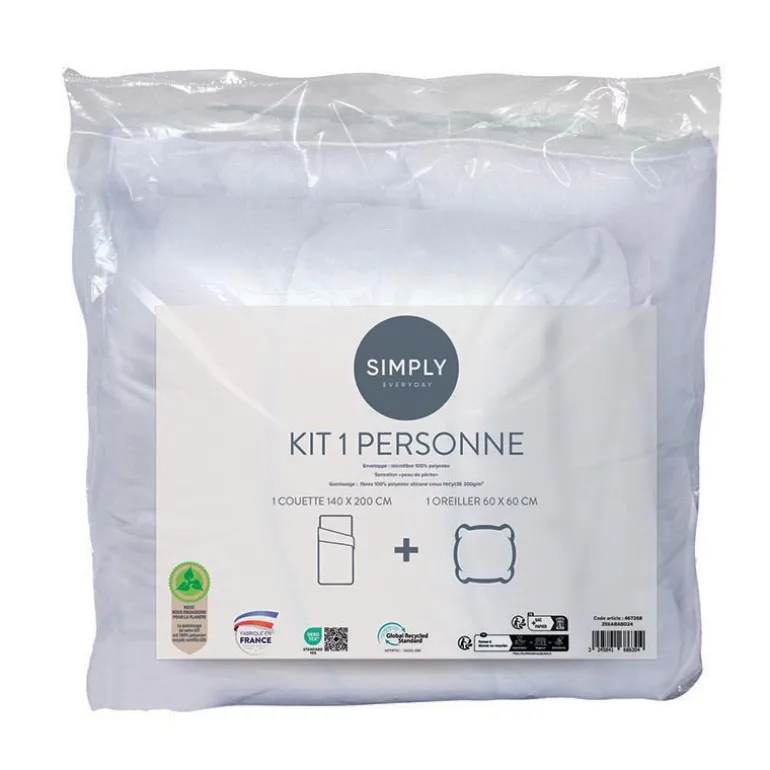 - OREILLER : ENVELOPPE MICROFIBRE 72g/mA² – GARNISSAGE 100% POLYESTER SILICONE CREUX 450G – FINITION BOURDON – COUETTE : ENVELOPPE MICROFIBRE DOUBLE FACE BLANCHE 72g/mA² – GARNISSAGE TEMPERE 300g/mA² – 100% POLYESTER SILICONE CREUX