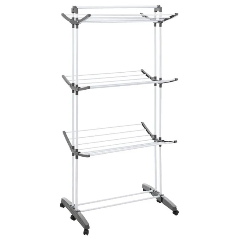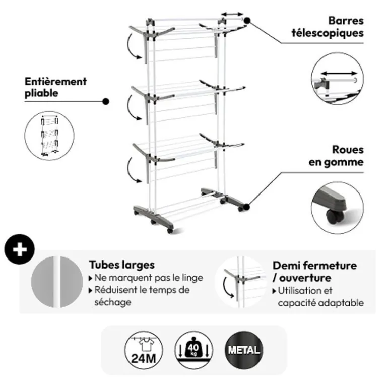 - 24 metres d’etendage – supporte jusqu’a 40kg – 3 niveaux – Demi fermeture/ouverture pour une utilisation et capacite adaptable Barre telescopique pour accrocher des cintres ou faciliter l’etendage du grand linge. Facile a deplacer grace a ses roulettes e